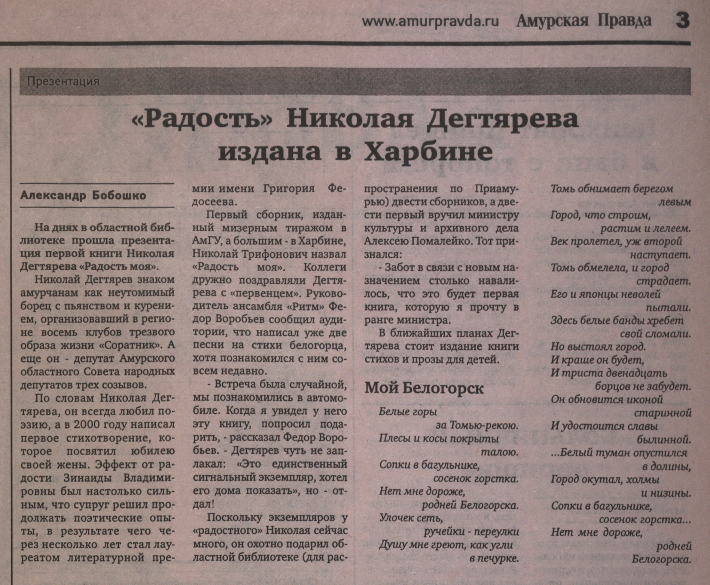 | Дегтярёв, Н. Т. Радость моя : [сб. стихов] / Н. Т. Дегтярёв. – Благовещенск : Издательство АмГУ, 2007. – 74, [2] с. : портр. – Текст (визуальный) : непосредственный. | |