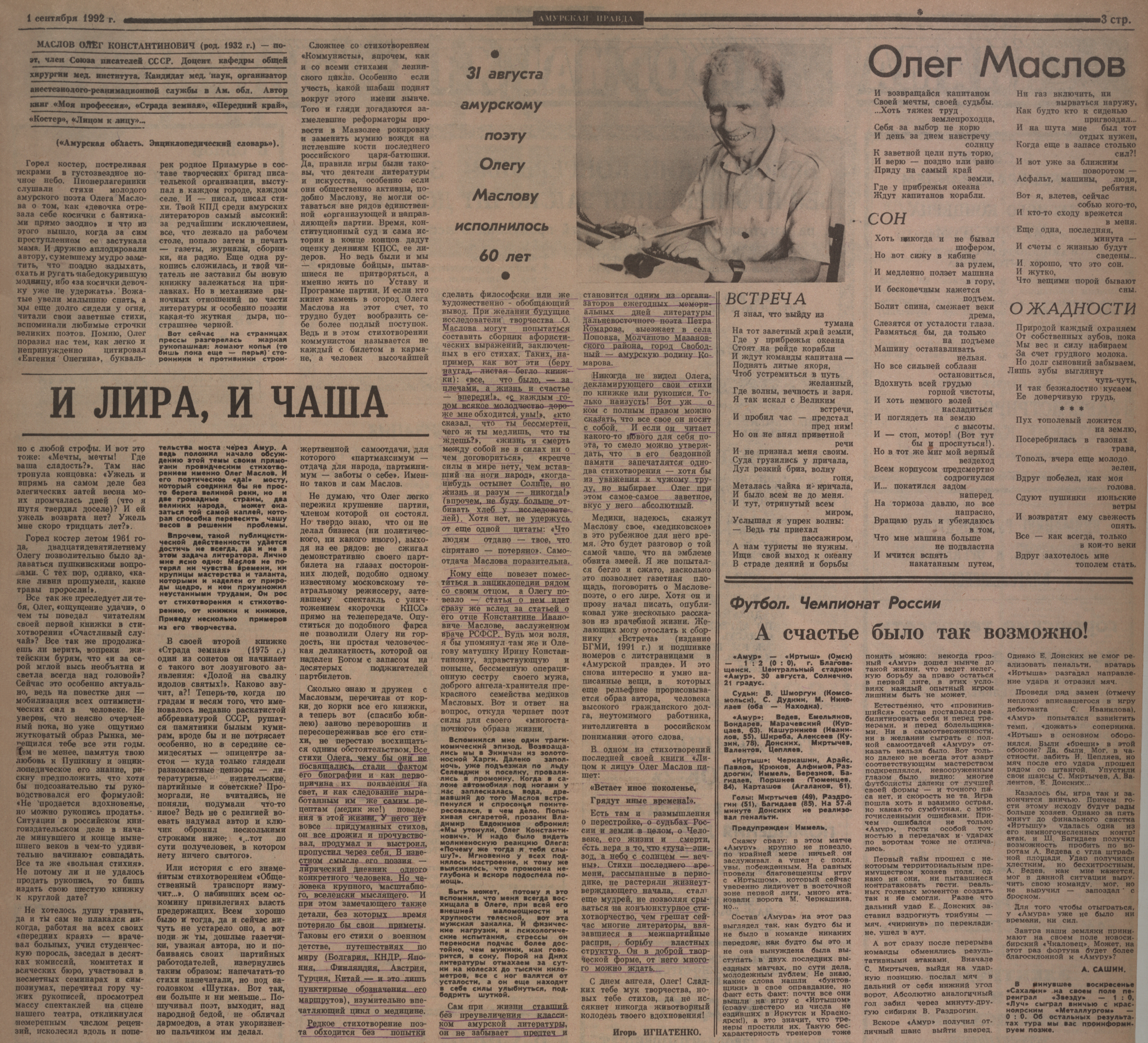 Поэзия для Олега Маслова – средство осмысления жизни, включая профессию, и доверительного общения с людьми. Маслов-поэт говорит лишь о том, что знает не понаслышке. Так, в стихотворении «Воспоминание» через сюжет воспоминание о друге из далёкого военного детства разыгрывается характерная и одновременно актуальная для Приамурья тема принадлежности его к России: