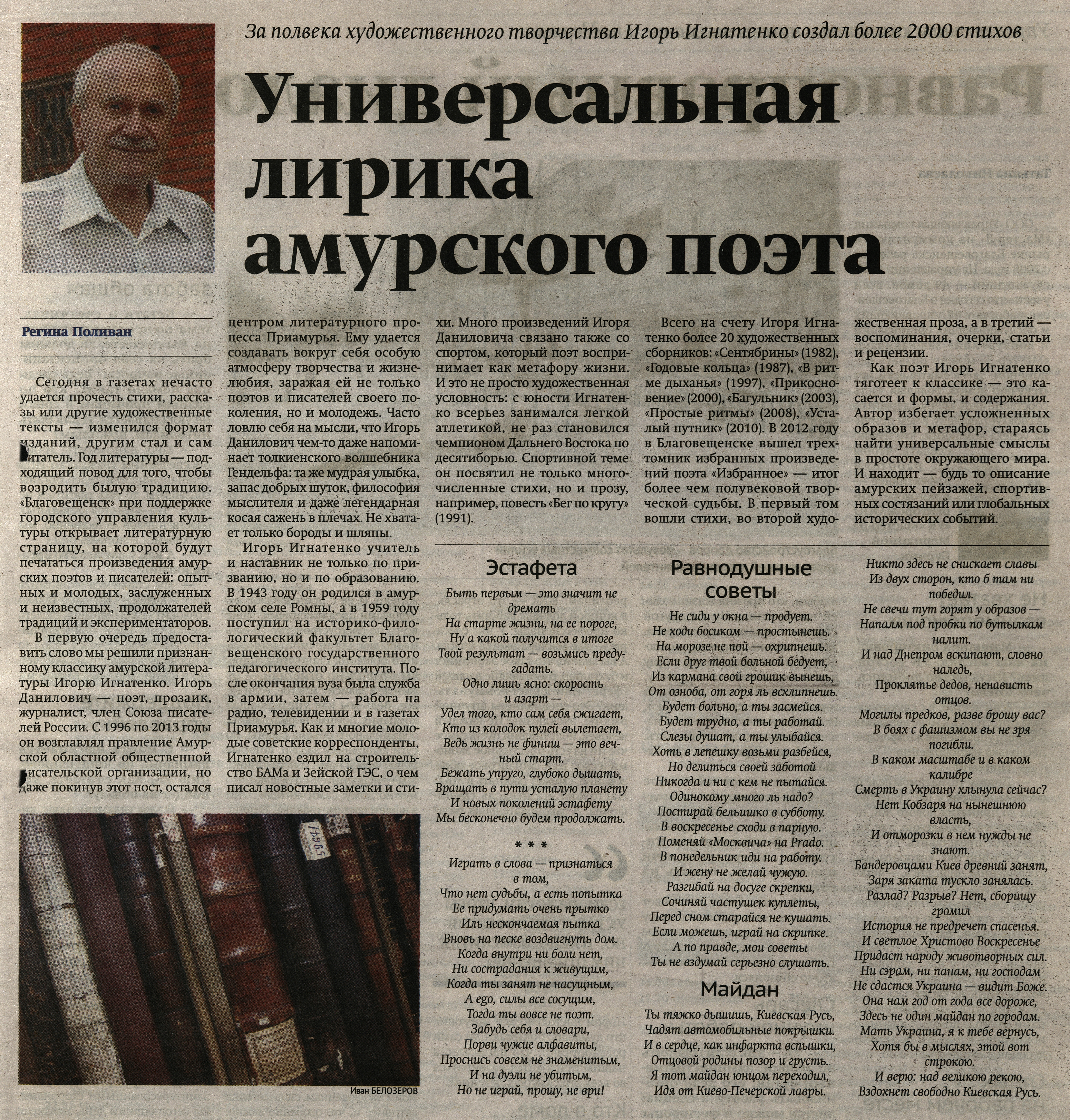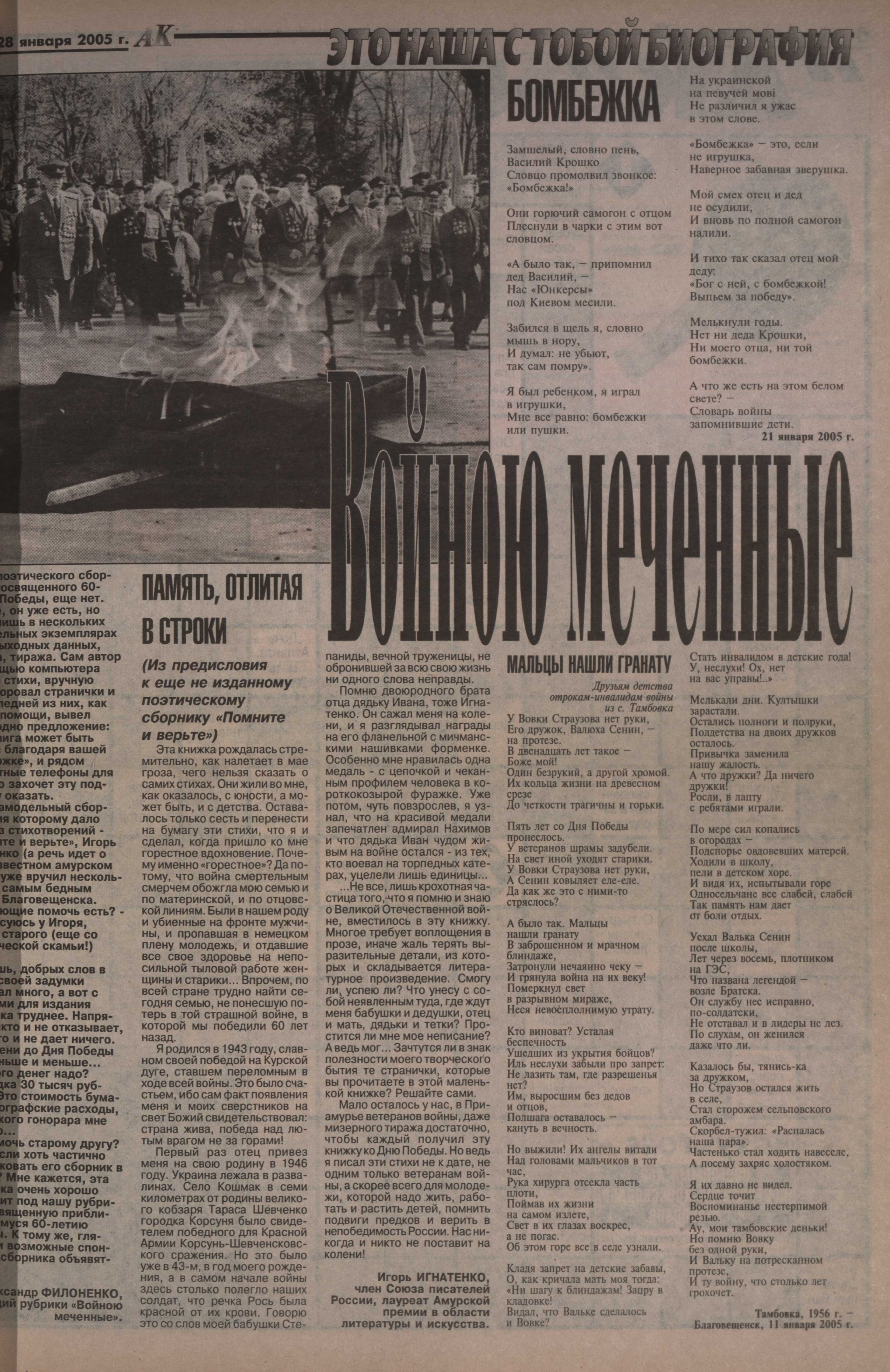 Известный амурский поэт Игорь Данилович Игнатенко родился в разгар войны 4 мая 1943 года (полная биография и библиография доступна здесь). Эта война смерчем обожгла семьи автора и по материнской, и по отцовской линии. Были в его роду и погибшие на фронте мужчины, и пропавшие в немецком плену юноши и девушки, и отдавшие всё своё здоровье на непосильной тыловой работе старики и подростки.
