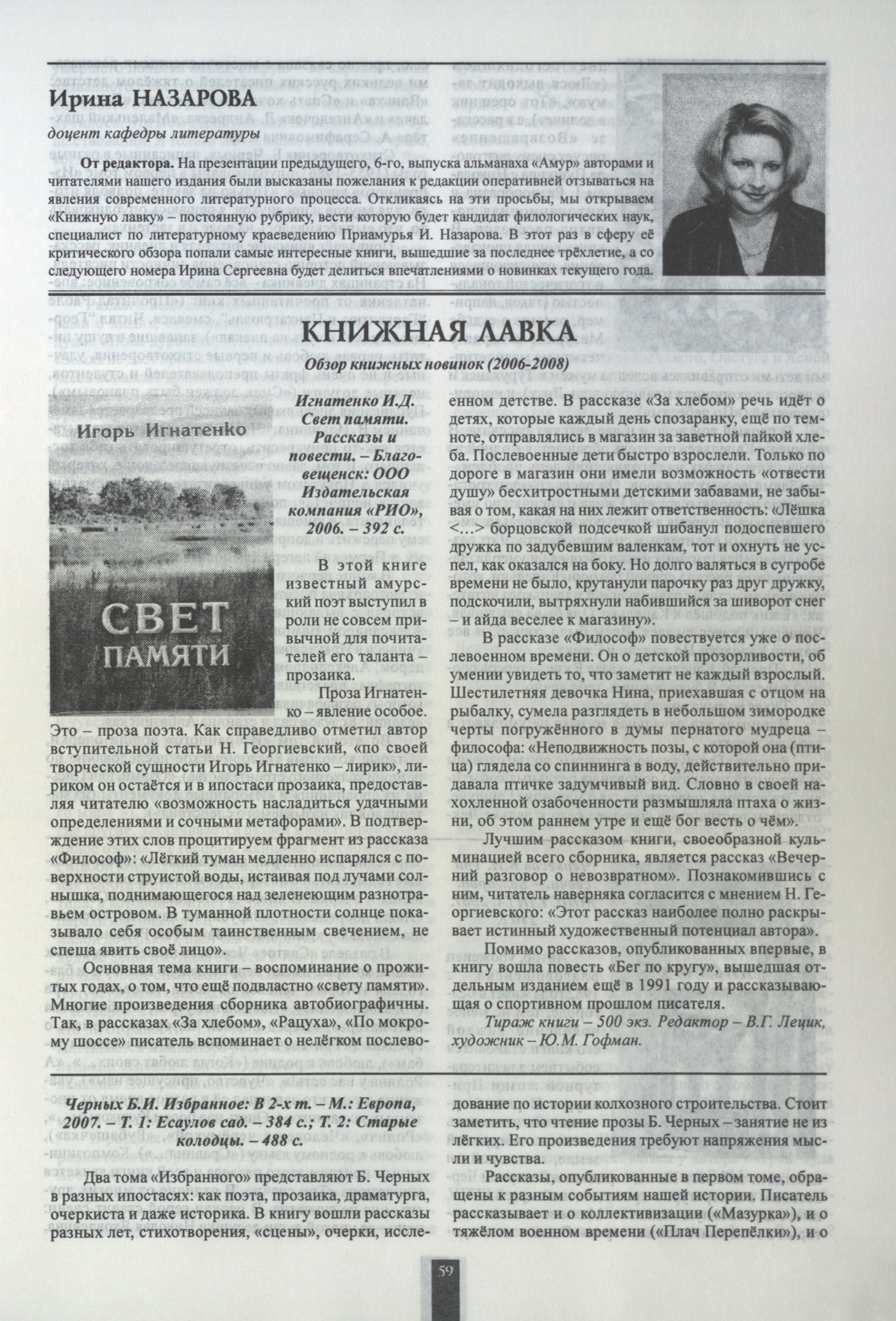 | Игнатенко, И. Д. Свет памяти : рассказы и повести / И. Д. Игнатенко. – Благовещенск : РИО, 2006. – 392 с. – Текст (визуальный) : непосредственный. | |