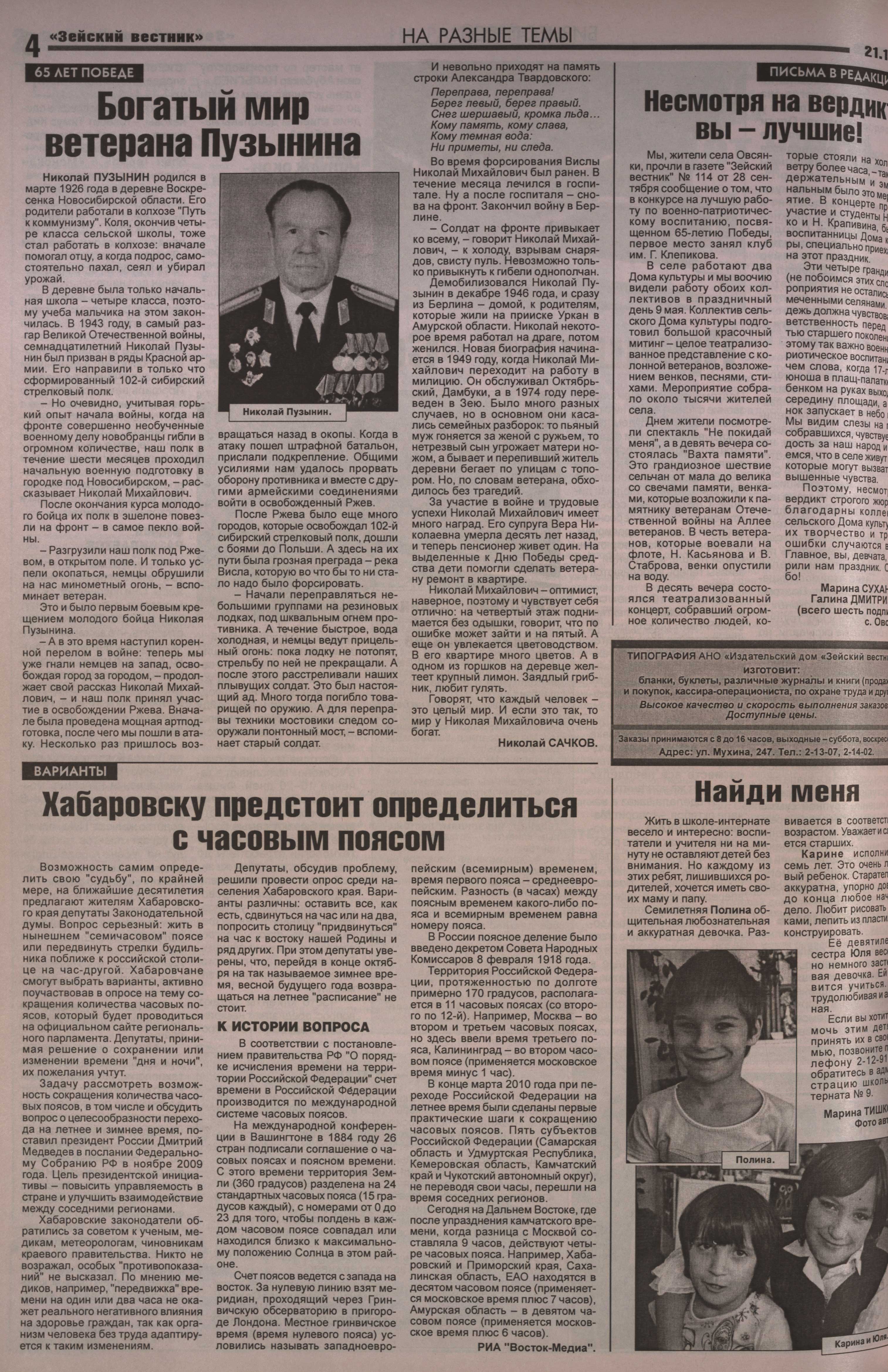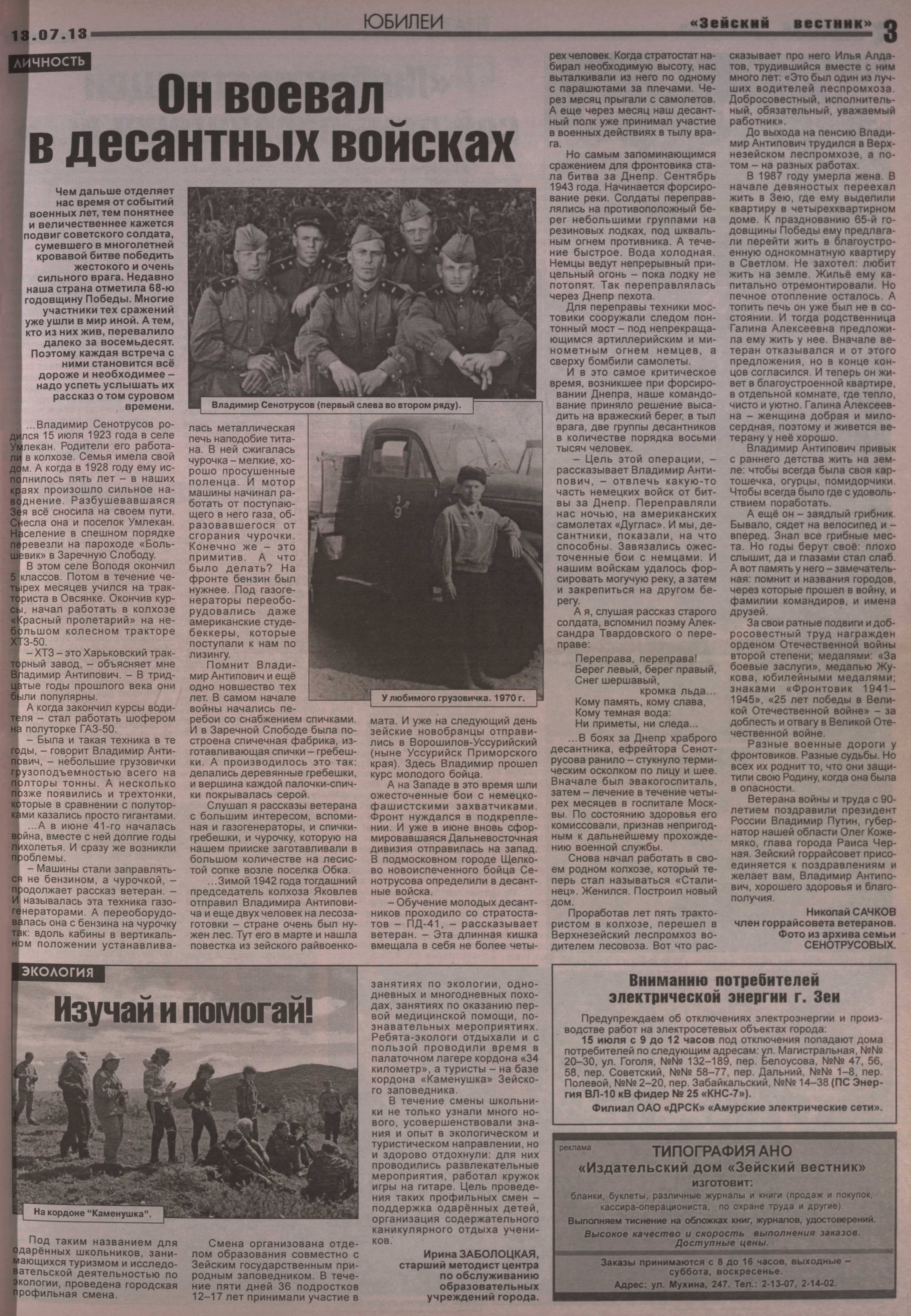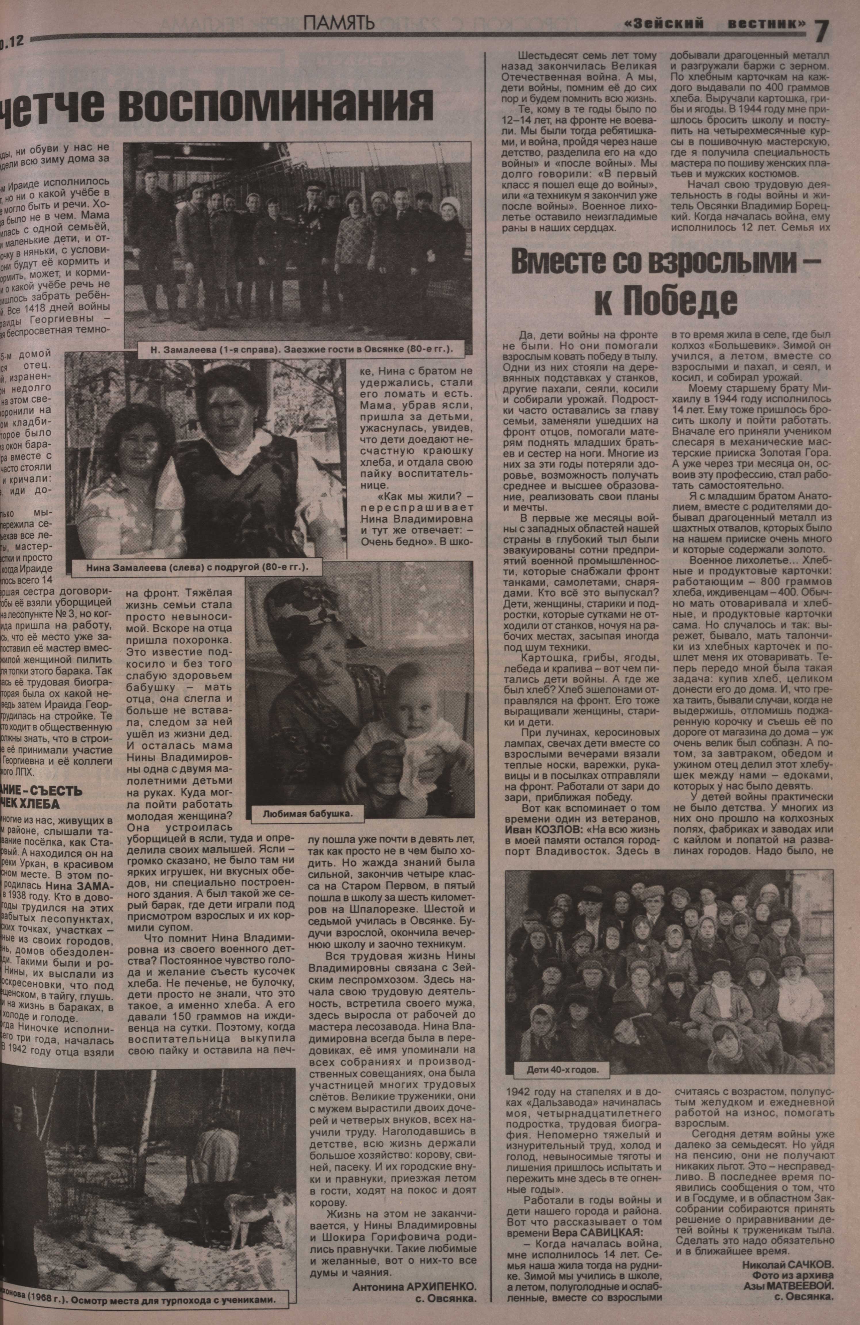 Не обделены вниманием Николая Сачкова и другие зейские участники войны - Н.М. Пузынин, Ф. Игнатов, А. Гаранин, В.А. Сенотрусов, С.А. Болтунов и многочисленные дети войны, разделившие судьбу самого писателя. С полным списком статей Николая Сачкова о героях войны вы можете ознакомиться ниже.